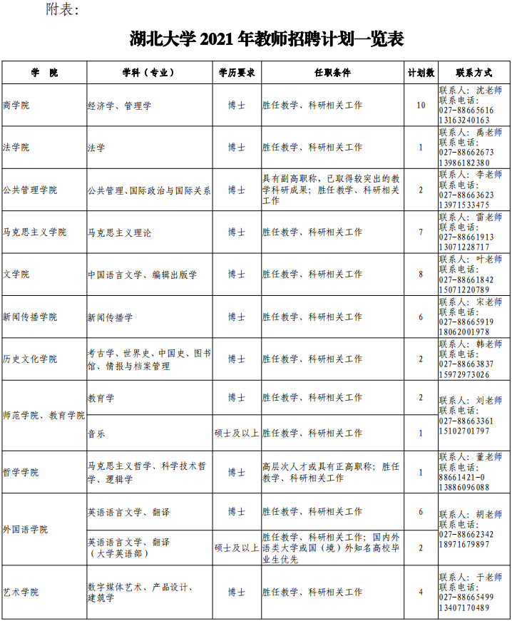 (二)教師招聘:見《湖北大學2021年教師招聘計劃一覽表》