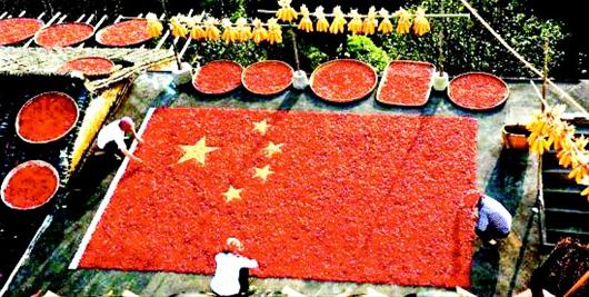 湖北日報訊 圖為:農家大媽用辣椒等農作物拼的國旗。(資料圖片)