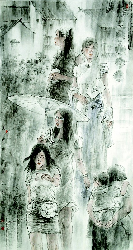 而與前輩們創(chuàng)作的喜悅與笑容所不同的是,胡智勇的作品借助柔和的色調(diào)、近似速寫(xiě)方式的人物動(dòng)態(tài)、輕松簡(jiǎn)潔的筆觸、輔助的色彩,讓自己的作品充滿(mǎn)了一種愉悅的輕松感。這種處理方法來(lái)自于他多年的在中國(guó)人物畫(huà)上經(jīng)驗(yàn)和積累。從某種意義上來(lái)看,胡智勇正是以他獨(dú)特的方式表達(dá)著對(duì)現(xiàn)代生活熱愛(ài),詮釋著生命之中永恒不變的話題,它因?yàn)樯l(fā)于內(nèi)心而顯得無(wú)比具有生氣。近期,胡智勇轉(zhuǎn)向了對(duì)都市人物的表現(xiàn)上,創(chuàng)作了《春雨醉江南》、《一樹(shù)桃花帶雨紅》等,則是對(duì)現(xiàn)代都市生活題材大膽嘗試的體現(xiàn)。