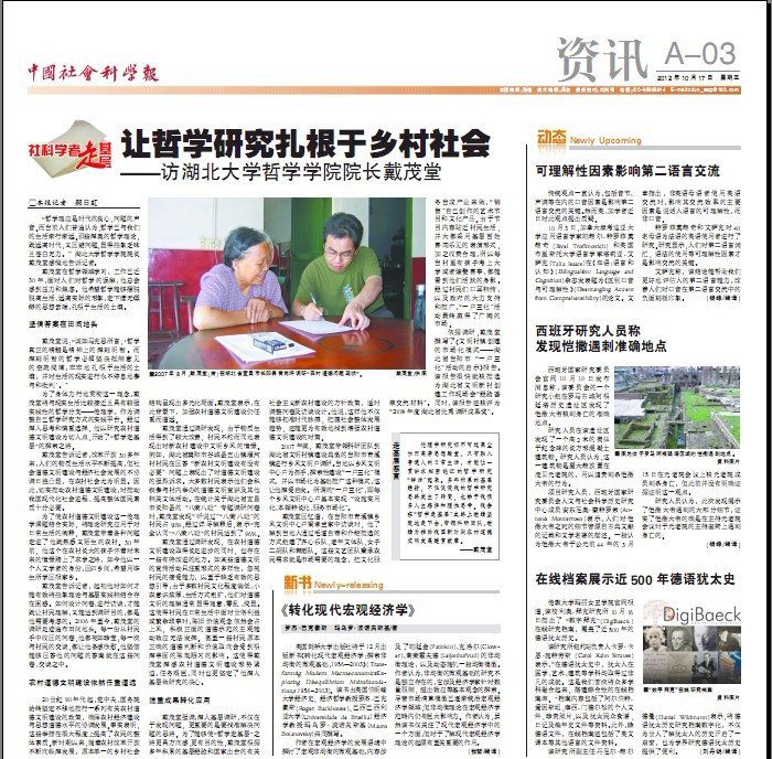 為了身體力行地貫徹這一理念,戴茂堂將與現實生活比較接近且具有較強實踐性的哲學分支——倫理學,作為調整自己哲學研究方式的實踐平臺。經過深入思考和慎重選擇,他以研究農村道德文明建設為切入點,開始了哲學走基層的探索之路。
