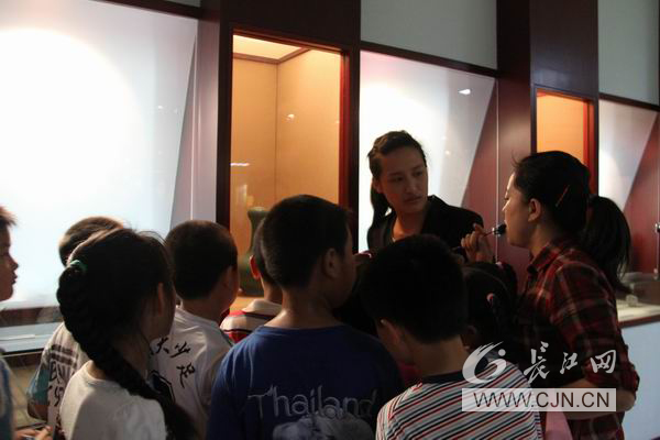 記者跟隨中小學生走進湖北大學博物館,放佛置身于一座藝術殿堂,豐富的館藏傳承著久遠的歷史信息,精美的布局透露出高雅的審美情趣,刀幣、玉如意、青銅佛像、鈞窯瓷洗這些文物吸引著學生們渴望求知的眼睛,革命題材展板前也簇擁著學生。