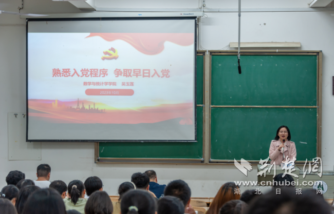 荊楚網(湖北日報網)訊(記者許文秀 通訊員杜強 吳玉蓮)“你為什么要入黨?”“入黨需要哪些流程?”10月26日晚,在湖北大學數學與統計學學院2023級新生入學教育現場,156名新生共上一堂別開生面的入黨啟蒙課。