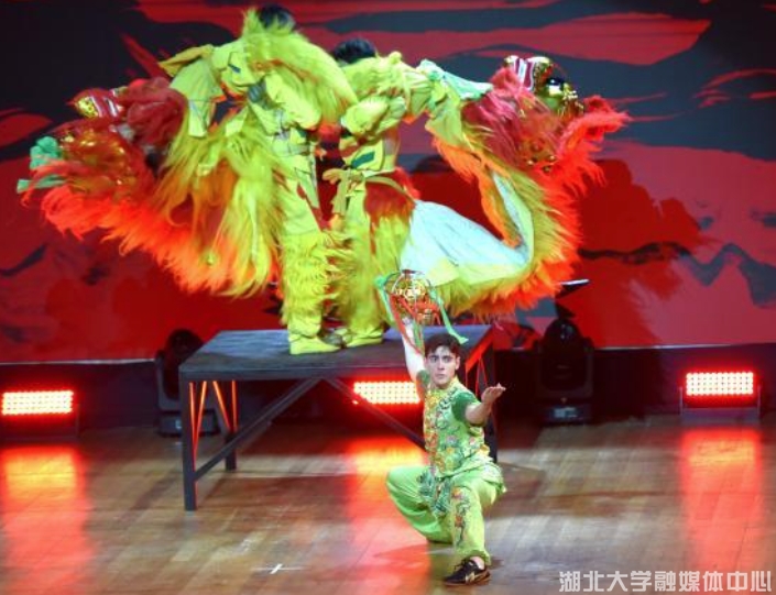 巴西留學生馬飛龍(前)舞獅表演《獅躍荊楚》劇照。林春茵 攝