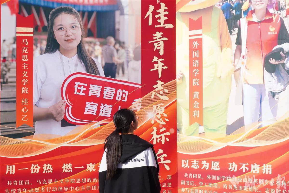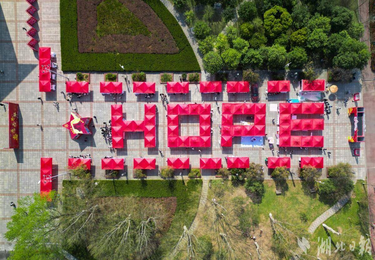 活動現場的展位,俯瞰構成“HOPE”字樣。該校青年志愿者協會聯合20多個學院的青年志愿者行動指導中心,策劃了各具特色的項目,不少學院設計的游戲互動和志愿服務體驗還凸顯了專業特色。