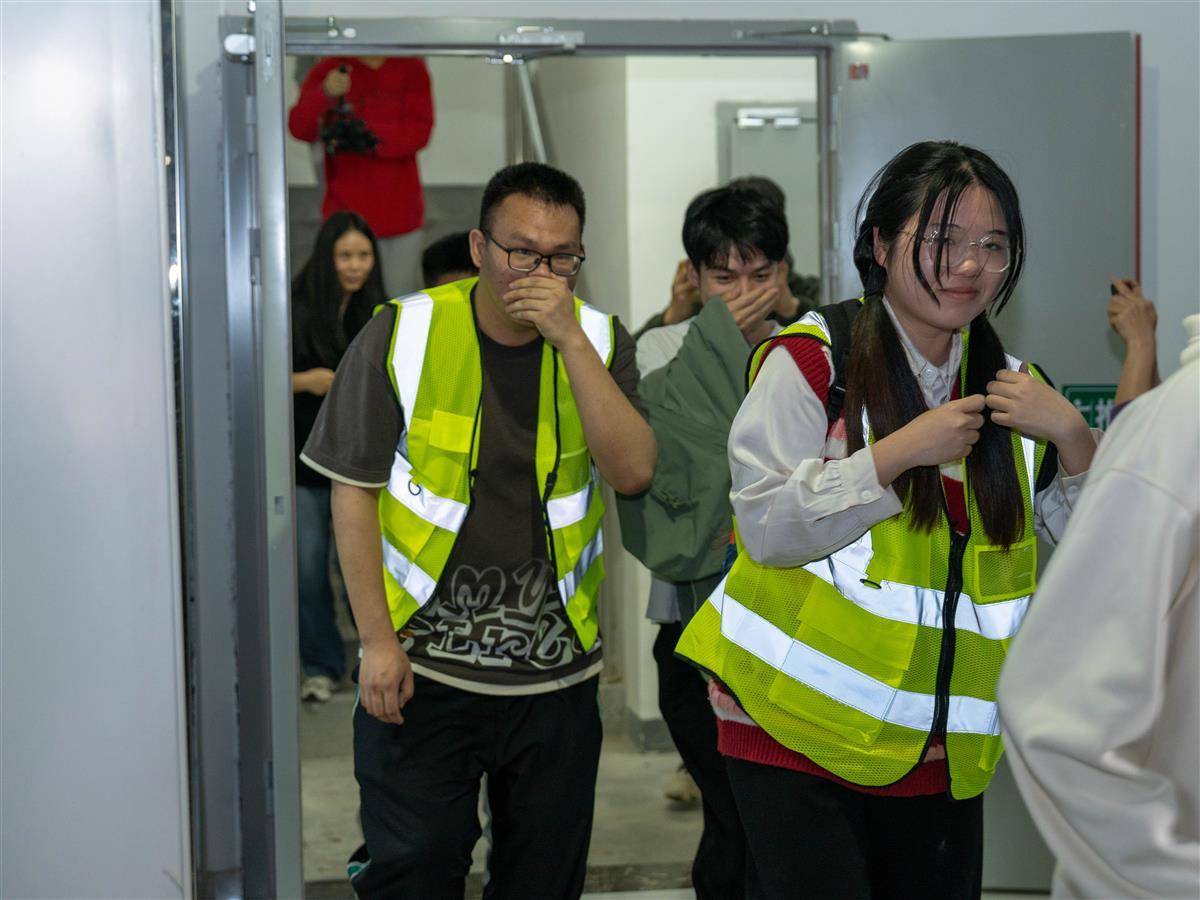 樓層安全員穿上熒光背心,手持消防手電筒,迅速跑到樓梯口附近,引導3至10樓的學生緊急疏散。學生們用濕毛巾捂住口鼻,沿著墻壁小跑下樓,快速撤離至安全地帶。同時,安保、宿管、醫生在疏散通道口進行接應,防止學生在疏散撤離中受傷。