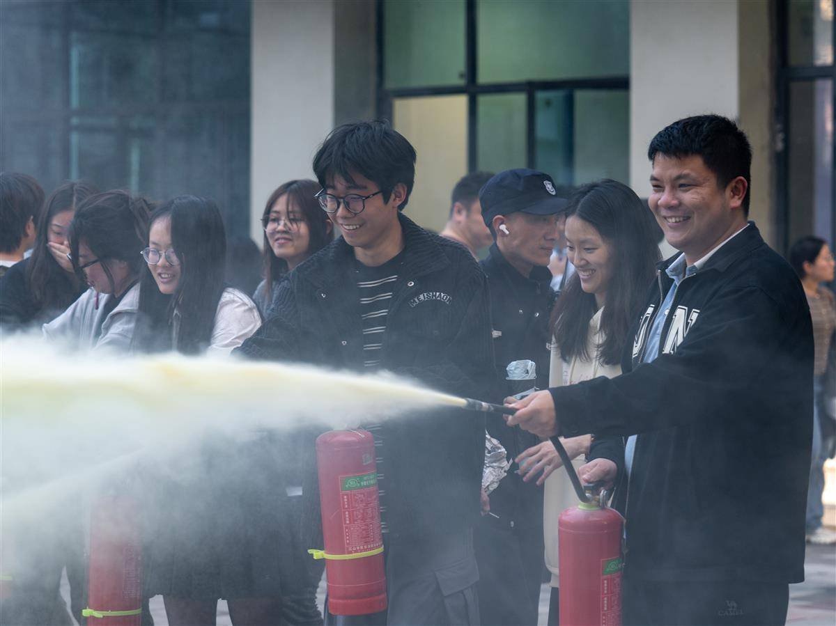 確認全部學生疏散撤離后,消防知識普及開始。消防員依次介紹消防車上的裝備,詳細講解使用場景及方法,輔之以操作展示。在滅火實操環節,輔導員和學生們輪流練習使用滅火器。