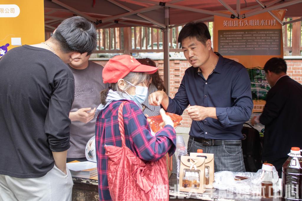 活動現場有一塊特殊的攤位,這是湖北英山縣石頭咀鎮大屋沖村、程早村等10個村及兩家公司的湖大“首秀”。他們帶來茶葉、油面、菜籽油、土蜂蜜等農產品,以優惠的價格參與展銷,向湖大學子、師生出售。2022級英語(師范類)學生何雨晴在品嘗了英山茗茶后,買下了兩盒,“這茶味道不錯!我買了也是給鄉村振興出力”。