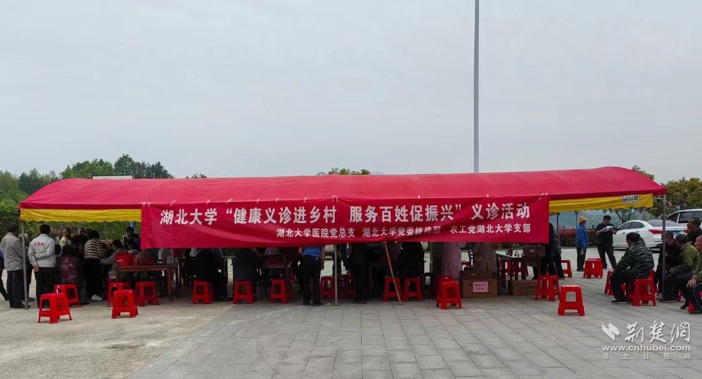 4月13日上午九點,在湖北大學醫院黨總支書記代漢文、院長曾祥英的帶領下,20余位醫務工作者來到湖北大學鄉村振興工作駐村點——英山縣石頭咀鎮大屋沖村開展送醫送藥大型義診活動。
