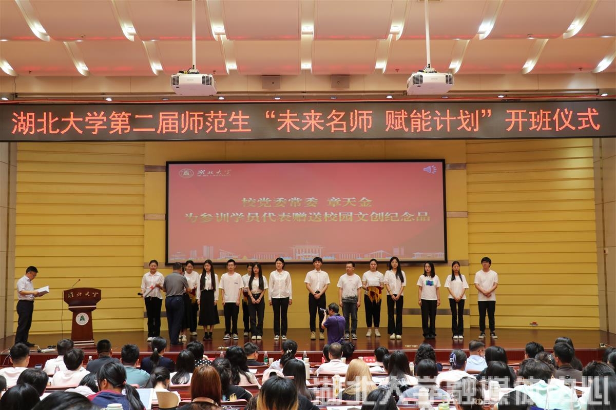 開班儀式上,湖北大學黨委常委章天金為參訓學員代表贈送了印有“學高為師,身正為范”的畢業生紀念品?!叭ツ晡倚J状伍_展職前培訓,得到了畢業生和用人單位的廣泛好評。今年我們繼續為大家送上這份精心準備的畢業禮物,就是希望大家帶著母校的期望和祝福,堅定踏上強師報國的新征程?!闭绿旖鸺恼Z道。他希望大家珍惜“人民教師”的第一身份、堅守“師德師風”的第一標準、抓實“教書育人”的第一要務,篤定從教理想、厚植教育情懷,爭當樂教愛生的“教壇后浪”,早日講出“好課”,磨出“金課”,用教師的“辛苦指數”提升學生的“成長指數”、家庭的“幸福指數”、國家的“實力指數”。
