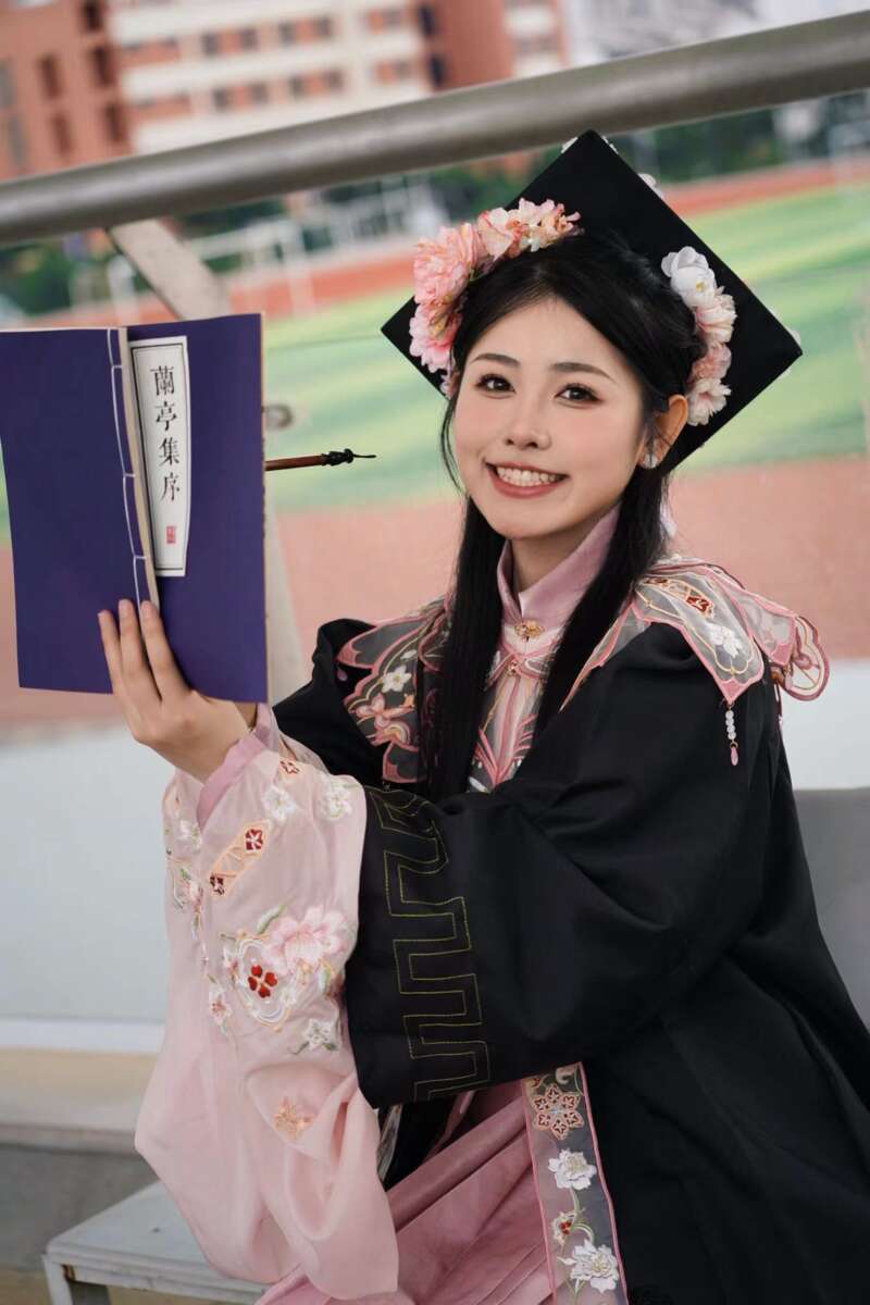 6月8日,昆明傳媒學院2024屆畢業生王倩同學,將國風簪花和馬面裙融入學士服中,“新中式搭配”讓畢業季創意滿滿。昆明傳媒學院 馮柳敏/攝