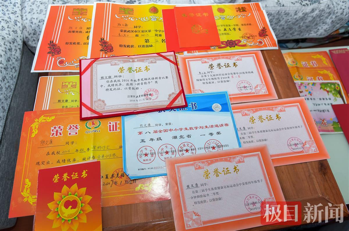 熊桂林的兒子熊文康就讀于江夏一中,在今年高考中取得了物理類570分的好成績,被湖北大學物理學院量子信息科學專業錄取。在家里,記者看到了熊文康從小學到高中獲得的眾多獎狀、榮譽證書。其中既有“5A學生”的綜合榮譽,也有作文比賽、田徑比賽等各個方面的單項證書,稱得上是全面發展。