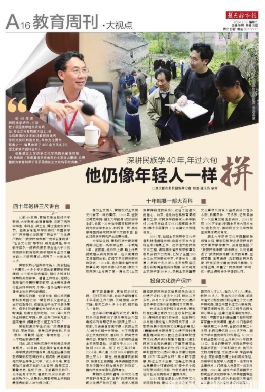 他40年深耕民族學研究,主持數(shù)十項民族學相關研究項目,將論文寫在荊楚大地上;他先后赴國內(nèi)外多地講解民族優(yōu)秀傳統(tǒng)文化和荊楚文化,并作為主要發(fā)起者之一,編纂出版了400余萬字的《中國土家族大百科全書》。